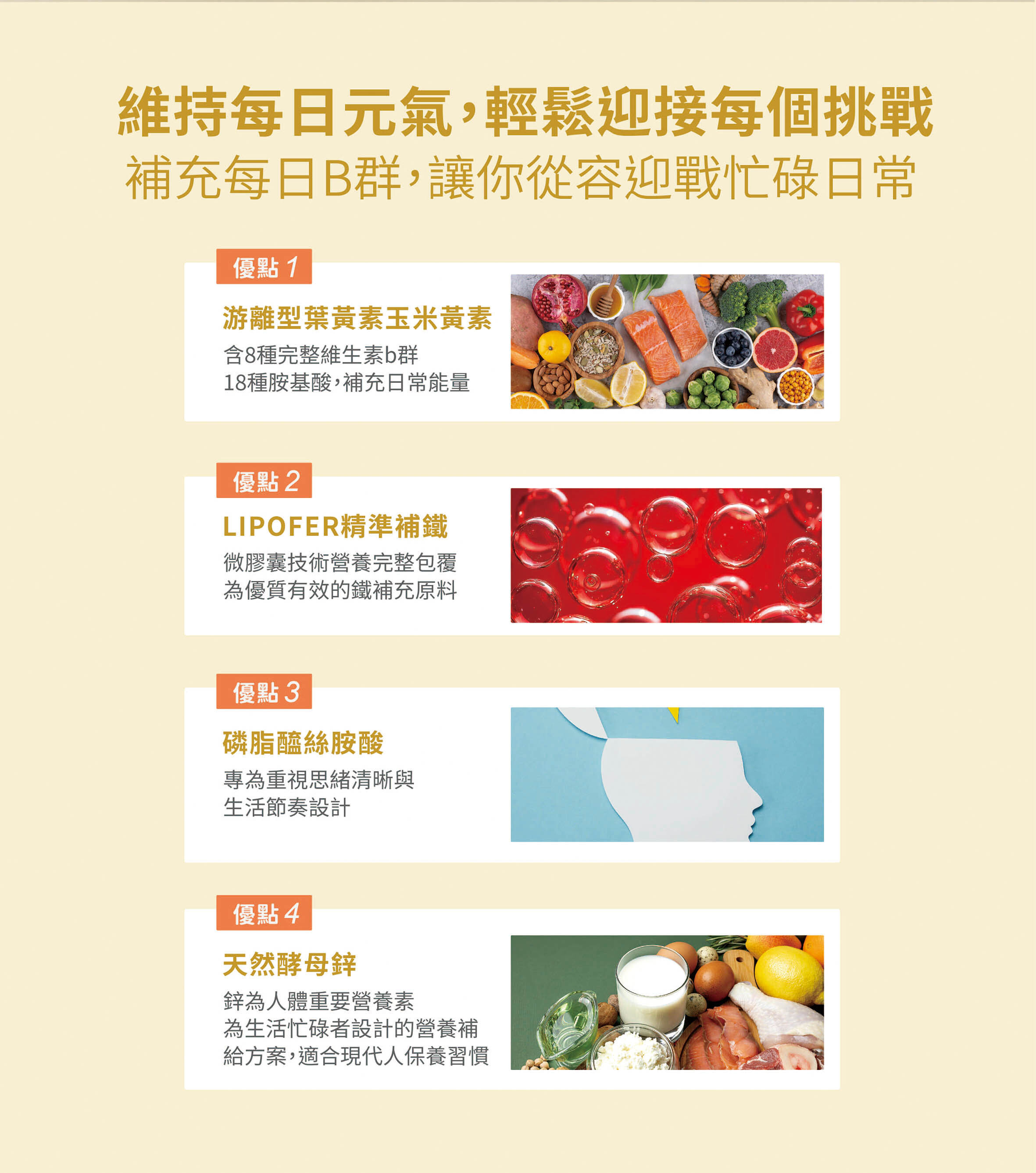 ⊝添加酵母B群大家族B1、B2、B6、B12等,8種完整維生素B群+18種氨基酸