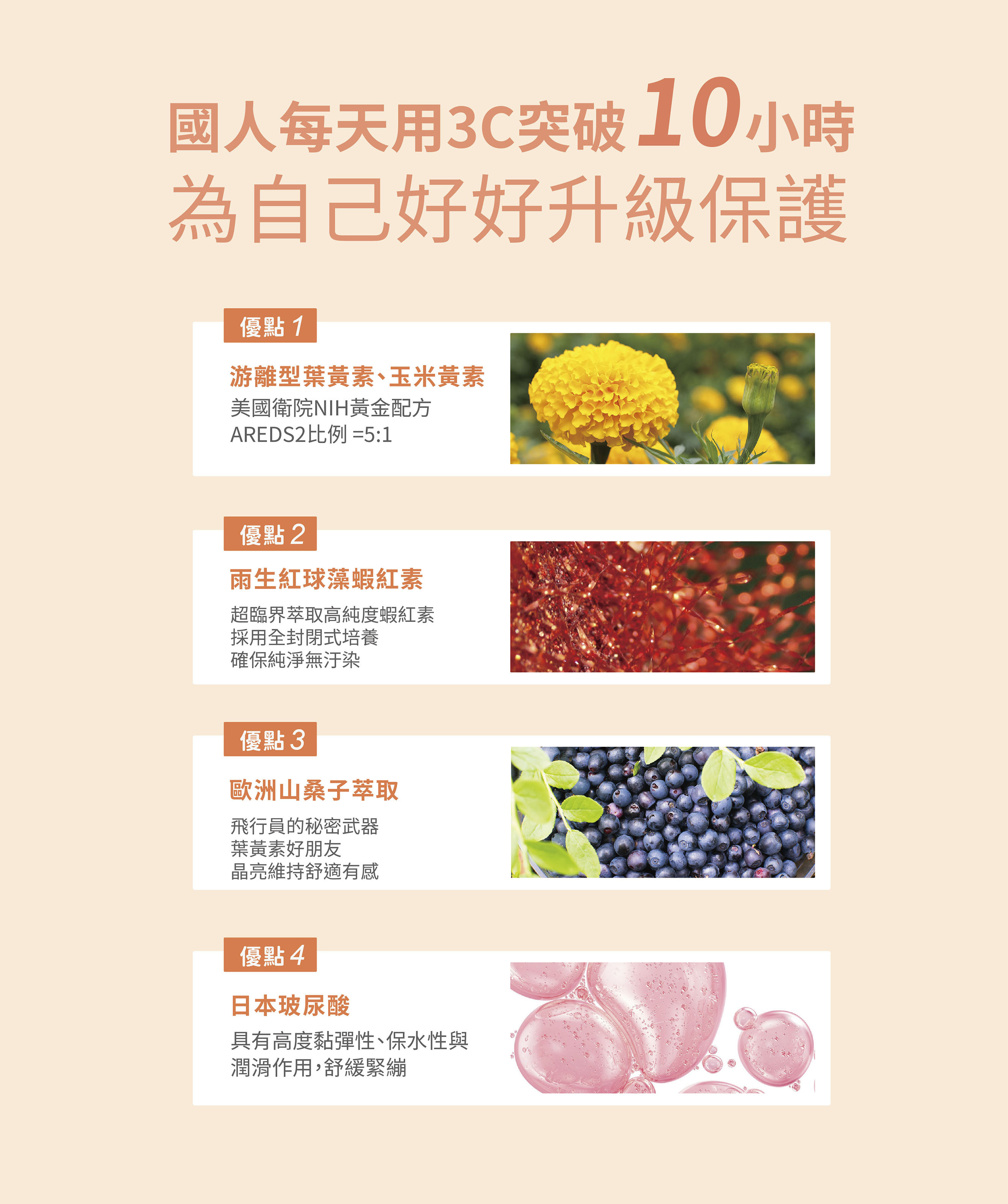 ⊝市面稀少消旋玉米黃素,每日減光配方