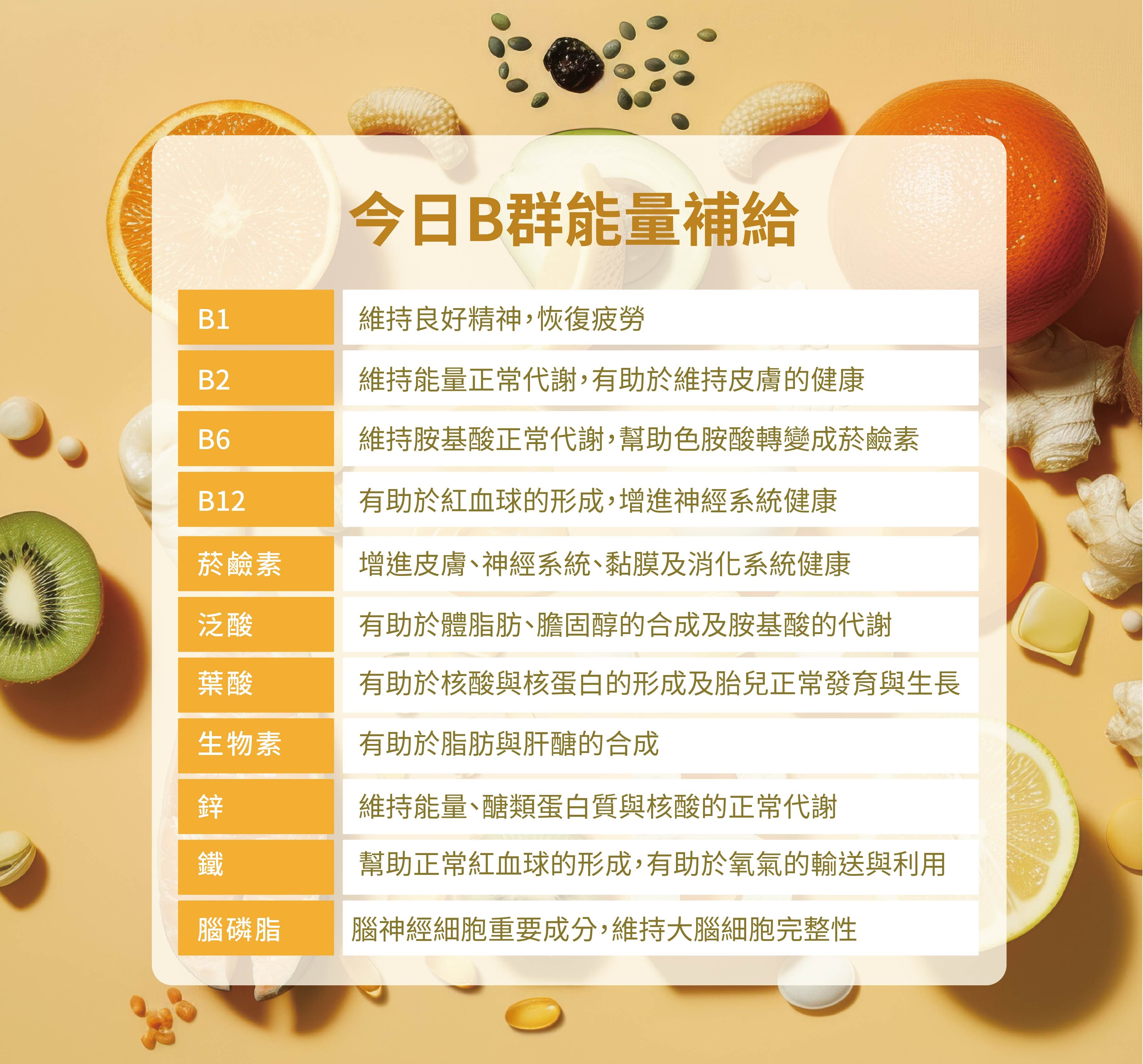 ⊝添加酵母B群大家族B1、B2、B6、B12等,8種完整維生素B群+18種氨基酸